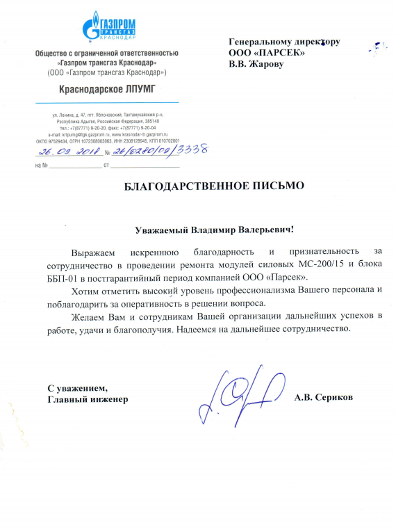 26.09.2018 Благодарность ООО "Газпром трансгаз Краснодар"