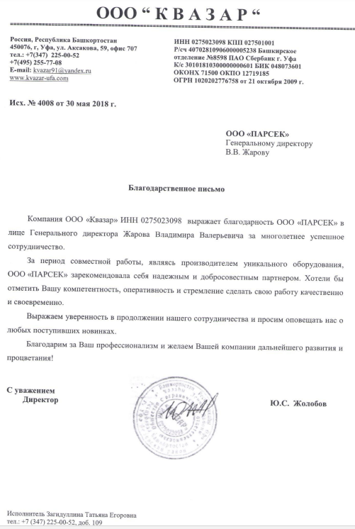 Благодарность ООО "Квазар"