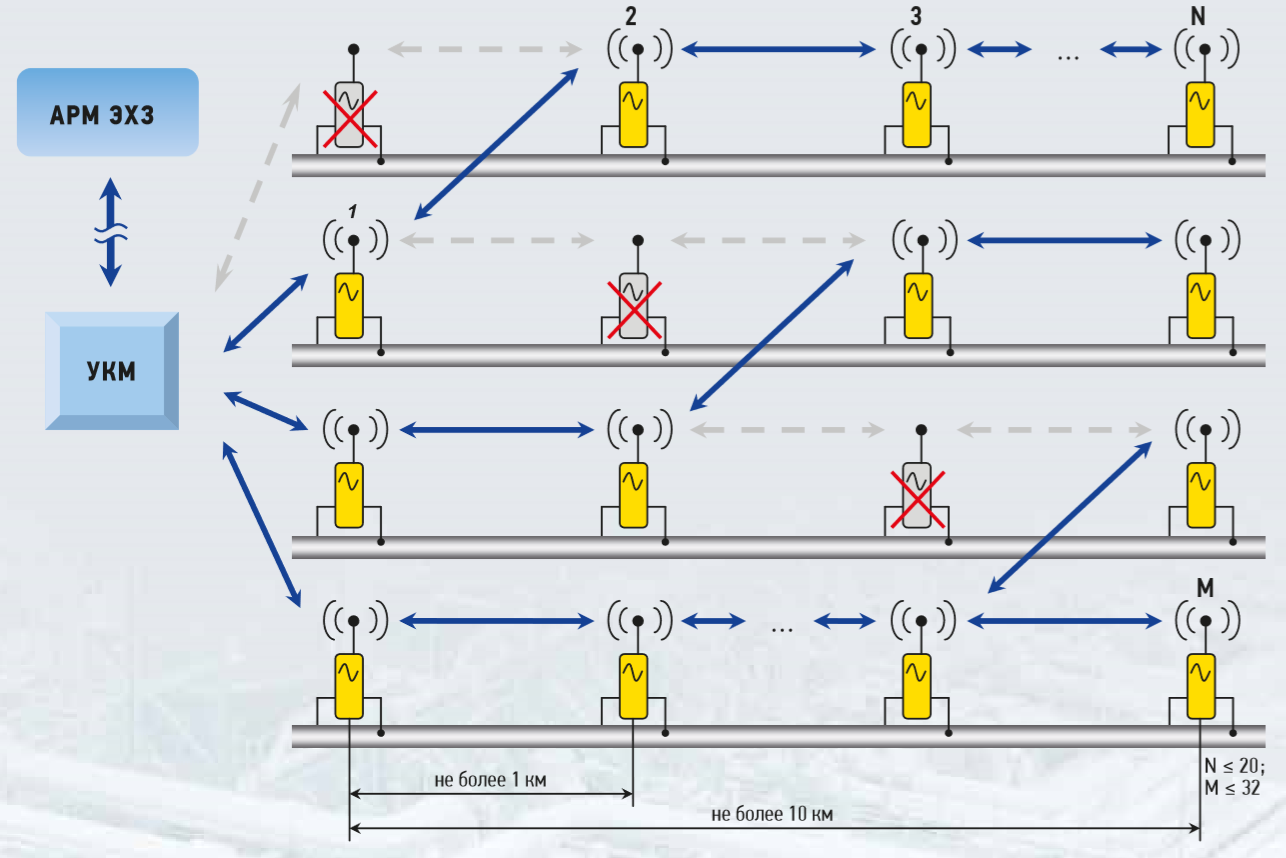 Сбор информации с КИП может осуществляться как проводным (RS-485), так и беспроводным способом по радиоканалу (433 МГц). Для протяженных объектов каждый из установленных КИП может выступать в качестве ретранслятора данных, что значительно увеличивает дальность установки КИП от базового модема (устройства сбора данных). Ретрансляция данных возможна на расстояние до 10 км (от базового модема), с возможностью обхода вышедшего из строя устройства КИП.