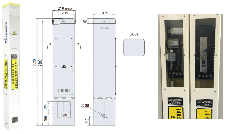 «Т2» – Пластиковый корпус квадратного сечения белого цвета с информационными надписями ПАО «Газпром», с шириной грани 200 мм, высотой 2500 мм, с отметкой уровня заглубления 700 мм. Нижняя грань клеммной панели (при одиночном размещении) должна располагаться внутри корпуса КИП на высоте не менее 1,3 м над уровнем грунта, при размещении в стойке двух клеммных панелей, указанное расстояние должно составлять не менее 0,9 м.